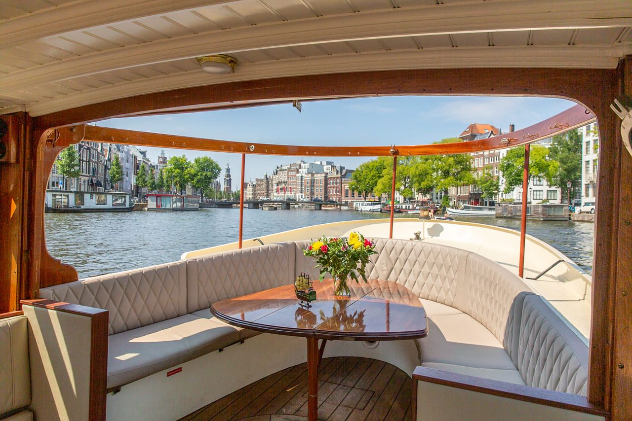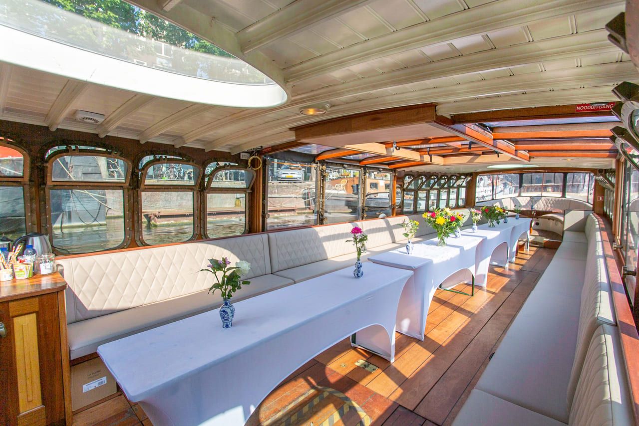 De Theo Kok is een romantische salonboot waarmee u heerlijk de Amsterdamse grachten kunt verkennen. Met de tafels uitgeklapt kunt u genieten van een heerlijk diner....